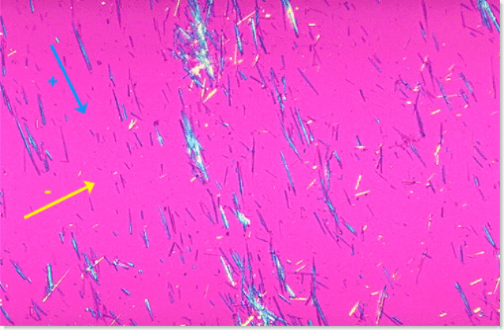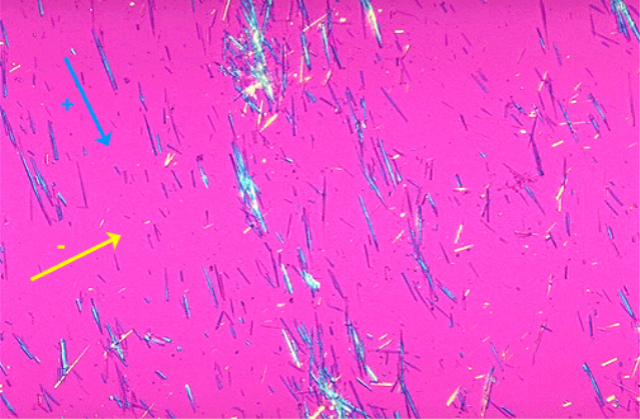 … except what we saw was about 100X as densely packed. These are monosodium urate crystals. You can tell this because they’re long and needle-shaped, and when you look at them under polarized light with a compensator (as in the above picture) they look yellow when they’re parallel to the compensator axis (the direction of the yellow arrow), and blue when perpendicular. There is absolutely no mistaking them for anything else.